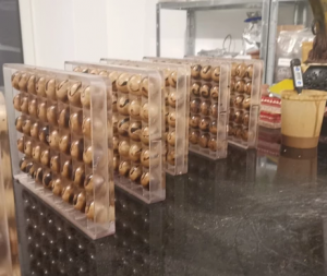 In meiner Produktion werden die Kuvertüren und Pralinenfüllungen selbst conchiert. Dadurch kann der Geschmack und die Intensität der Halbfabrikate auf das Endprodukt abgestimmt werden.